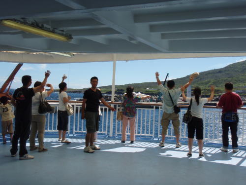 ≪かめりあ丸≫乗り込んだ一同、離れていく方々に精いっぱい手を振ります。